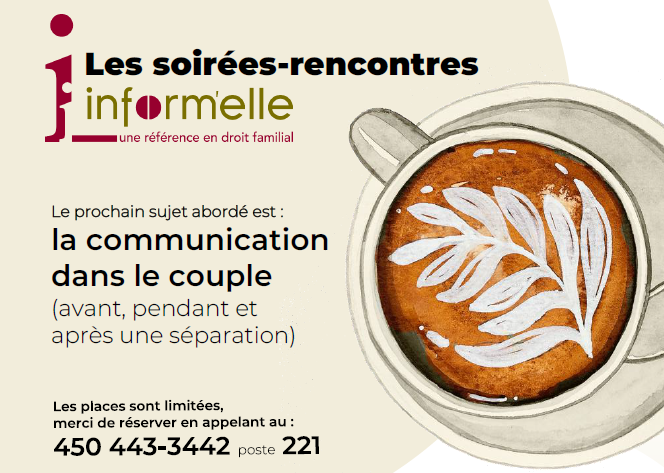 COMMUNIQUÉ - Inform’elle modifie sa formule de «cafés-rencontres» pour proposer une formule en soirée les «soirées-rencontres» afin de permettre aux personnes qui ne sont pas disponibles en journée de venir partager leurs expériences autour d’un bon café et d’une collation. Pour cette première édition en soirée, nous allons aborder un sujet passionnant : la communication dans le couple, avant, pendant et après une séparation. La communication est en effet un véritable enjeu de société qui comporte son lot d’obstacles et d’incompréhensions. Savez-vous les décoder? Savez-vous comment les contourner? Avez-vous envie d’en parler?