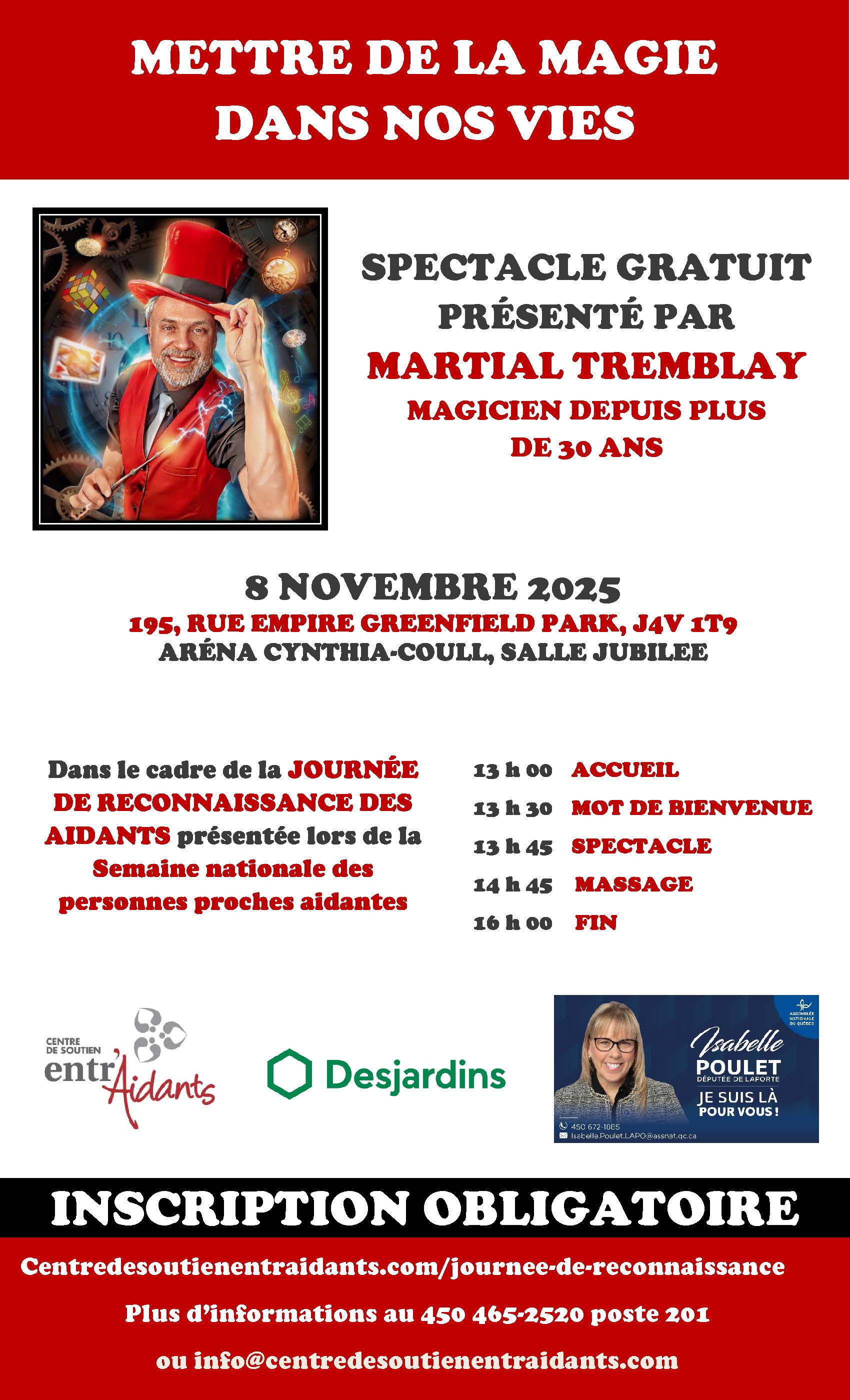 En cette édition 2025, nous souhaitons rejoindre un nombre maximum de proches aidants en offrant un spectacle de magie par Martial Tremblay : METTRE DE LA MAGIE DANS NOS VIES.