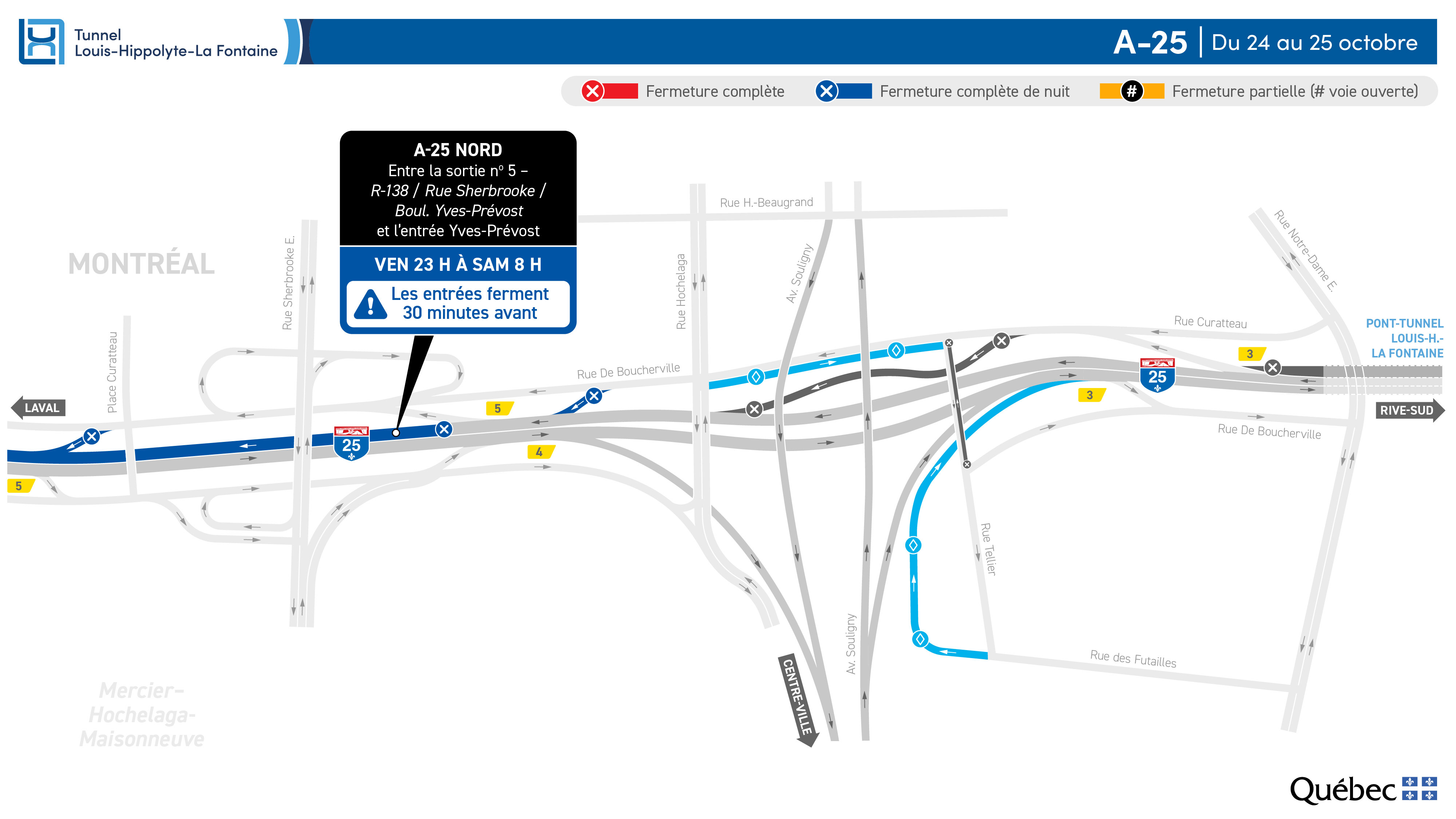 Plus précisément, l'autoroute 25 en direction nord sera complètement fermée entre  la sortie n° 5 (route 138, rue Sherbrooke, boulevard Yves-Prévost) et l’entrée en provenance du boulevard Yves-Prévost, de ce vendredi 23 h à ce samedi 8 h. « Les entrées en provenance des rues Hochelaga et Sherbrooke Est seront fermées 30 minutes avant la fermeture de l’autoroute ».