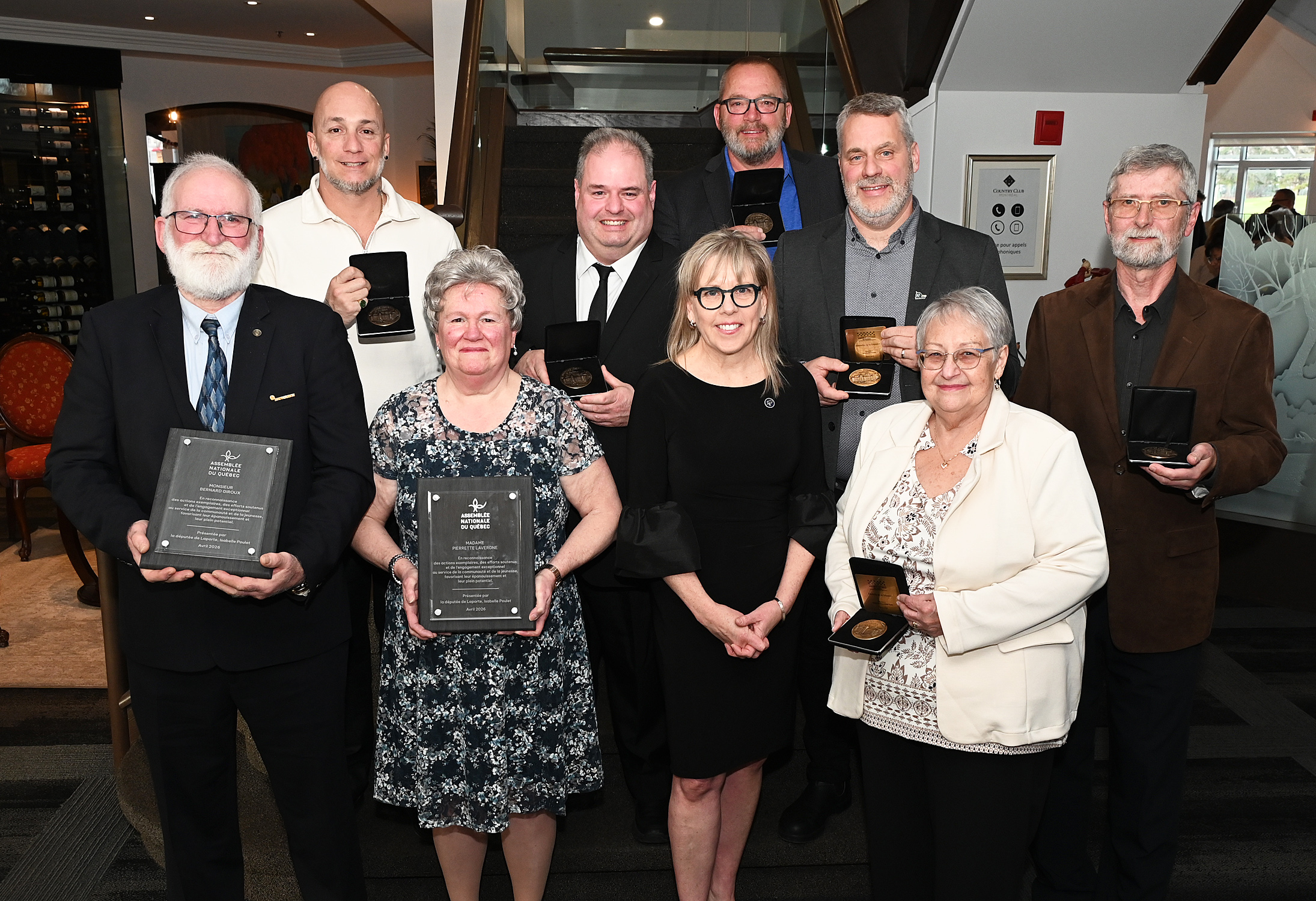 COMMUNIQUÉ – Des citoyens et organismes d’exception ont été honorés pour leur engagement remarquable au sein de la communauté. La députée de Laporte, Isabelle Poulet, leur a remis la médaille de la députée de l’Assemblée nationale lors d’une cérémonie officielle. Parmi les récipiendaires figurent Jacques Lemire, Terrance Deslage et Stéphane Plante, ainsi que le club FADOQ de Greenfield Park, l’Association de football Greenfield Park Packers et la Société d’horticulture de Saint-Lambert, en plus de décerner une plaque honorifique à Pierrette Lavergne et Bernard Giroux.