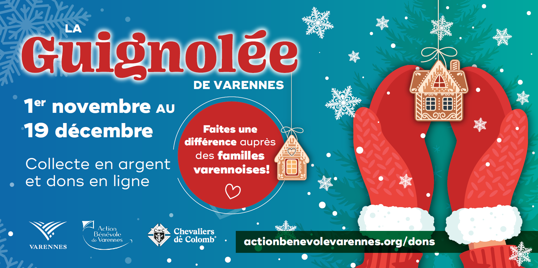COMMUNIQUÉ - La Ville de Varennes est heureuse d’annoncer le lancement de la Guignolée 2025, qui se déroulera du 15 novembre au 19 décembre. Cette campagne de solidarité, organisée en collaboration avec Action bénévole de Varennes et les Chevaliers de Colomb, vise à soutenir les familles de la communauté en situation de précarité.