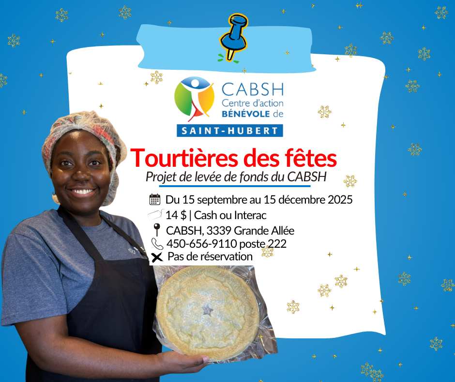 COMMUNIQUÉ: Le Centre d’action bénévole de Saint-Hubert (CABSH) lance sa traditionnelle levée de fonds avec la tourtière des Fêtes, préparée avec soin par ses bénévoles. Chaque tourtière, ainsi que nos pâtés au poulet et au saumon, est offerte au prix de 14 $ pour 6 à 8 personnes. Les tartes aux pommes et tartes au sucre complètent notre offre gourmande pour la période des Fêtes.