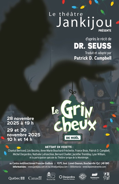 COMMUNIQUÉ: Le théâtre Jankijou de Boucherville vous invite à son premier spectacle de la saison. « Le Grinch » dans une adaptation du livre de Dr. Seuss. Ce classique du temps des fêtes, depuis plus de 60 ans est adapté et traduit par notre metteur en scène depuis plus de 20 ans avec Jankijou, M. Patrick D. Campbell. Le spectacle est d’une durée d’une heure et s’adresse aux enfants de 5 à 9 ans, dans l’âme. Il sera présenté selon l’horaire suivant :