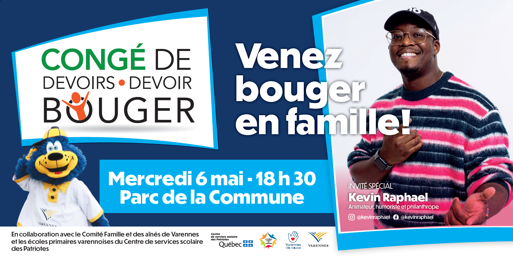 COMMUNIQUÉ - Le conseil municipal, en collaboration avec le Centre de services scolaire des Patriotes, les écoles primaires ainsi que le comité Famille et des aînés de Varennes, invite les jeunes du primaire et leurs familles à l’événement Congé de devoirs, devoir bouger, qui se tiendra le mercredi 6 mai à 18 h 30 au parc de la Commune.